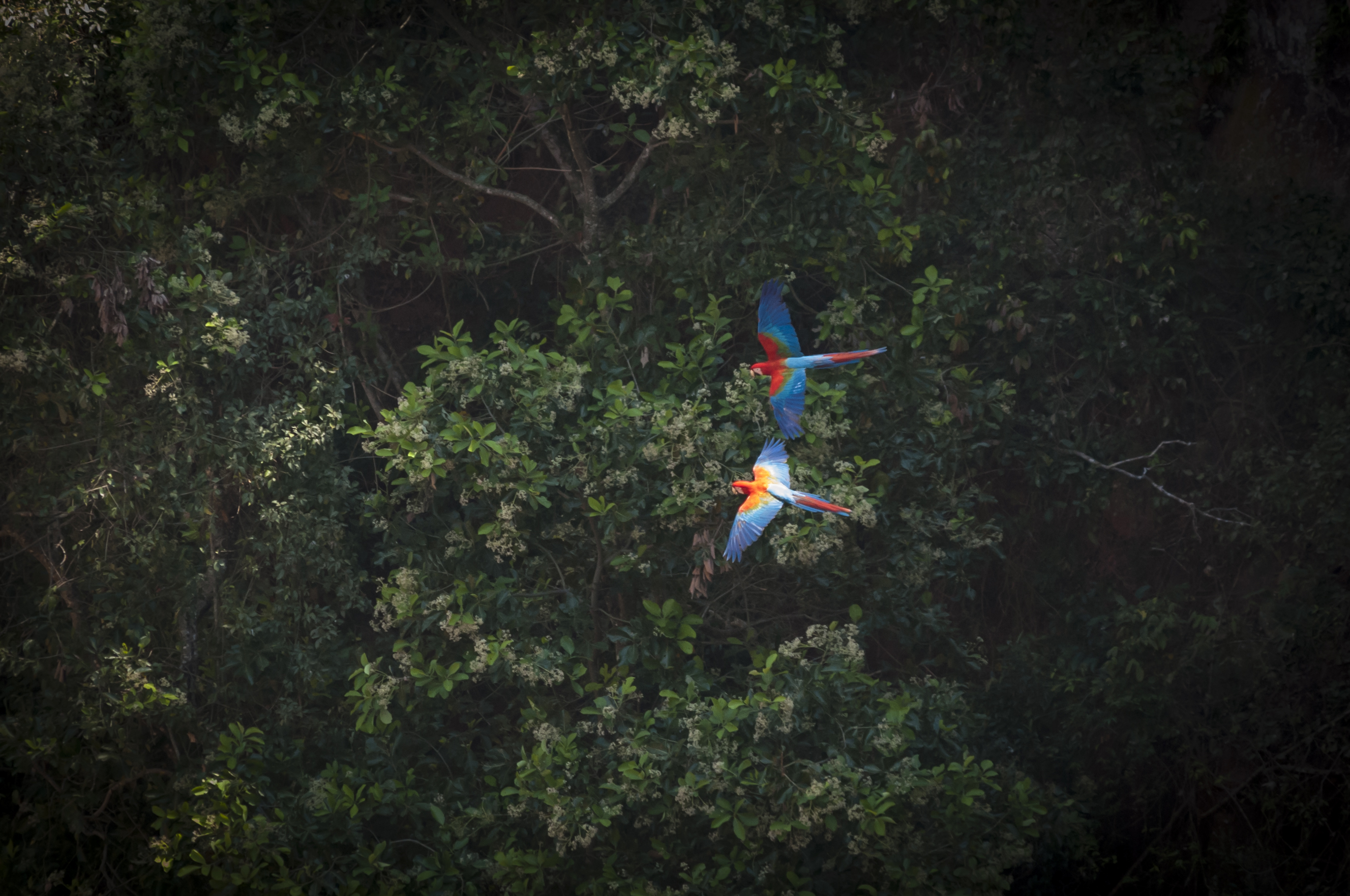 Two Arara flying in the Atlantic Forest in Brazil, credit: iStock