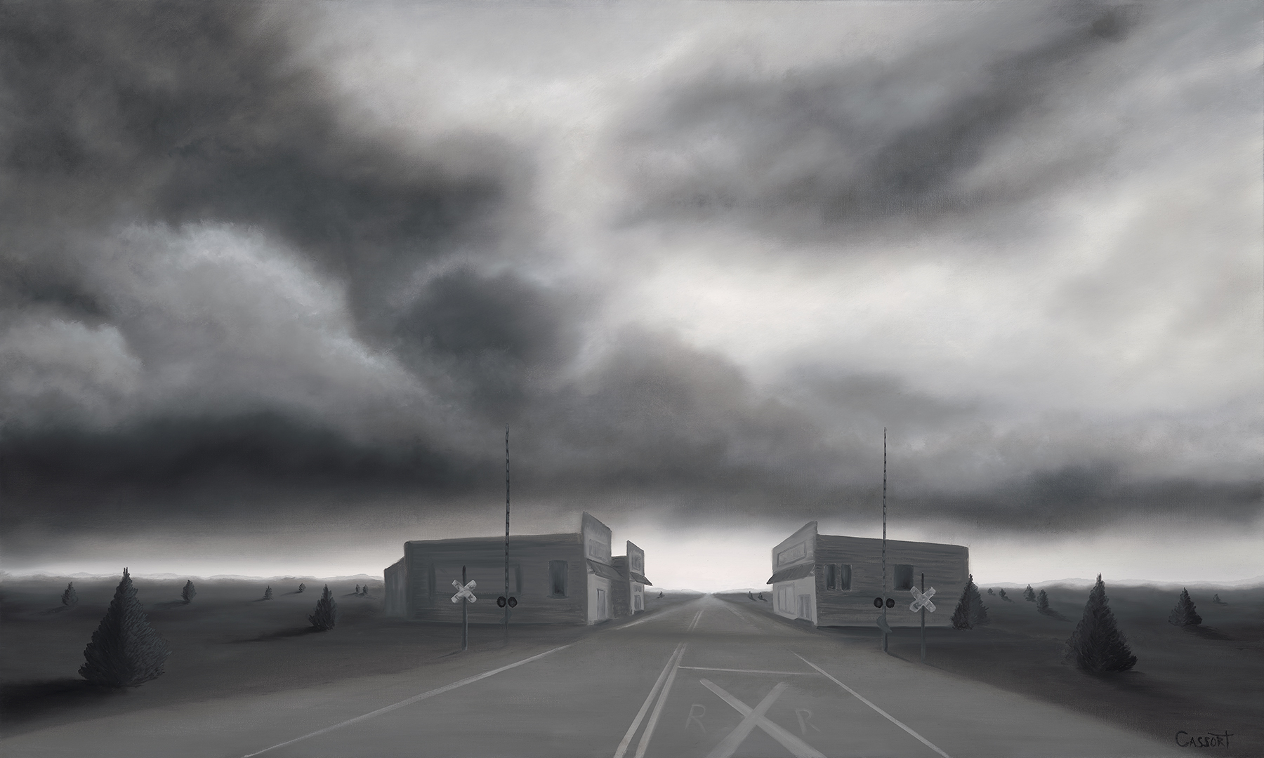 Brett Cassort is an award-winning artist whose work explores the emotional space where darkness and light meet, capturing themes of solitude, reflection, and resilience. Drawing inspiration from time on the road, his process begins with photographs taken from the dashboard of his car, moments that mirror the internal landscapes people navigate. Through contrast, mood, and restrained color, Cassort creates atmospheric compositions that reflect not just what a landscape looks like, but what it feels like to move through it.
